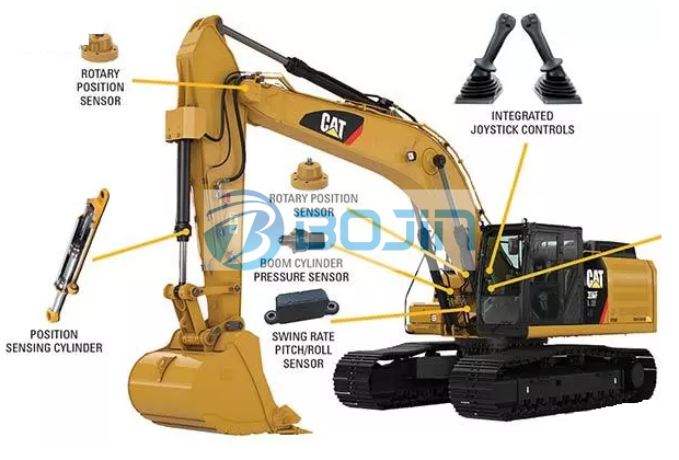 當然,上述系統可以簡化。比如我們只考慮斗桿和鏟斗,那么,只需要測量斗桿的相對的傾斜角度、鏟斗相對的轉角,以及鏟斗油缸的壓力,用預置的斗桿和鏟斗的幾何和重量參數也能計算出負載的重量。雖然沒有確切證據,但似乎新型卡特320和323就采用了與F系列不完全相同的稱重系統。可以看出,鏟斗搖臂銷軸處有傳感器,測量這里的轉角也可以推算出鏟斗的轉角,大臂和小臂上也有傳感器,目前還不清楚哪些是和稱重系統有關的,哪些是和2D坡度控制系統有關的,或者是共用的。