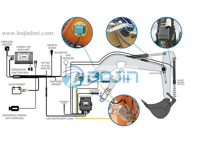 其原理是利用多種傳感器,來獲取挖斗的位置信息,同時檢測液壓管路的壓力,計算出挖斗物體的重量。